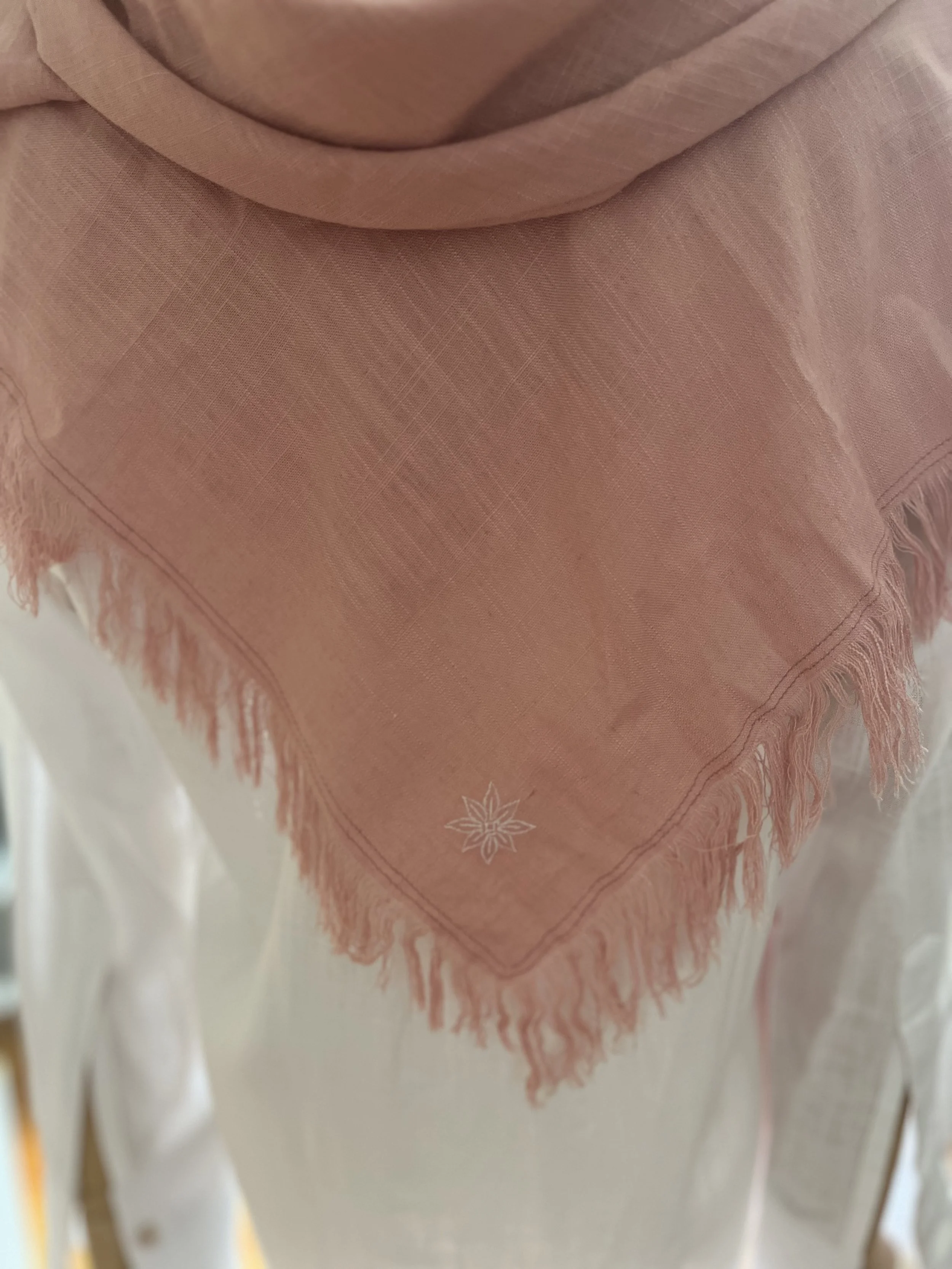 Our Casablanca Statement Scarf strikes a luxuriously comfortable chord, whether draped or styled. It’s adorned with A White Shirt's signature embroidered lotus motif, adding a touch of artistry to its timeless design.